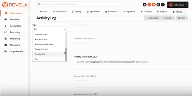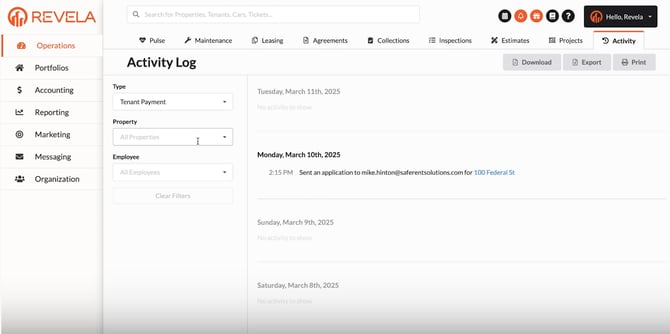 Purpose: This guide explains how to use the Activity Tab and Operations Menu in the Revela Portal to track tenant activities and streamline property management.