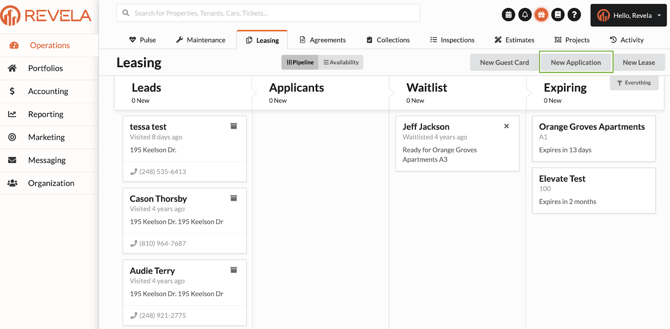 Navigate to Operations (left menu) > Leasing (top toolbar) in Revela