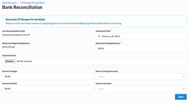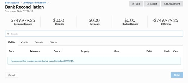 To reconcile a bank account, navigate to Organization > Bank Accounts and select the account you want to reconcile. Select 'Reconcile' from the Actions button drop down menu.