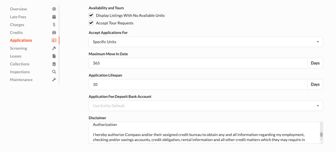 Disclaimer - This is an open text field that allows property management companies to add their own custom disclaimer text. This populates on the application when a prospect is entering their information.