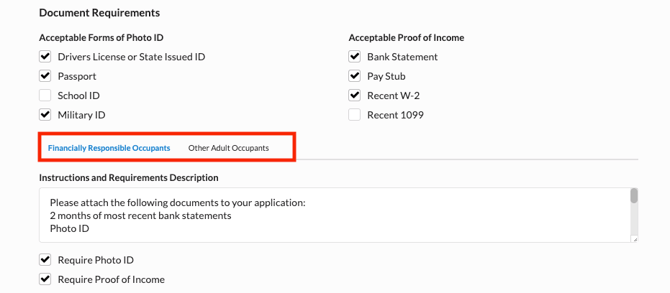 NOTE: The requirements can change by clicking on Financially Responsible Occupants and Other Adult Occupants. This allows you to set different requirements and instructions based on the applicant type.