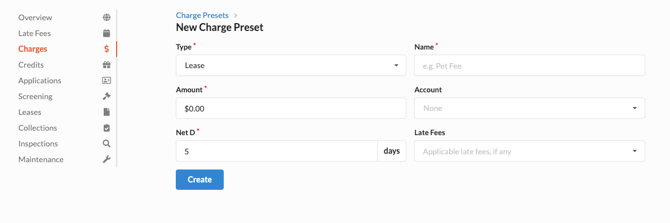 Purpose: This guide explains how property managers can create a charge preset which can be used during the application, leasing, and miscellaneous scenarios for invoicing tenants.