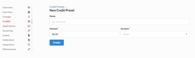 Purpose: This guide explains how property managers can create a credit preset which can be used when crediting tenants for miscellaneous items (rent, late fees, bad debt, etc.)