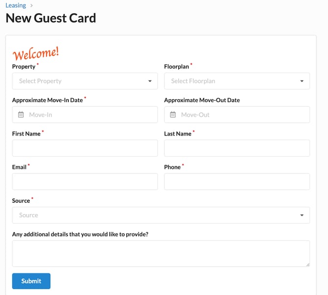 - Internal Users and Employees - Internal Users are able to generate Leads by clicking the ‘New Guest Card’ button on the Leasing Dashboard: