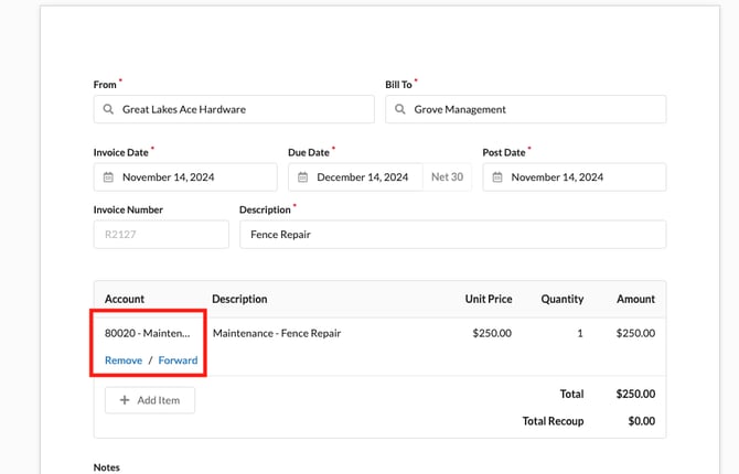 Step 4: To invoice the property owner for the work completed, you will create the invoice as shown below and select “Forward” next to each line item. This allows you to forward an invoice to the property owner to submit payment. This will also populate on the owner's statement.