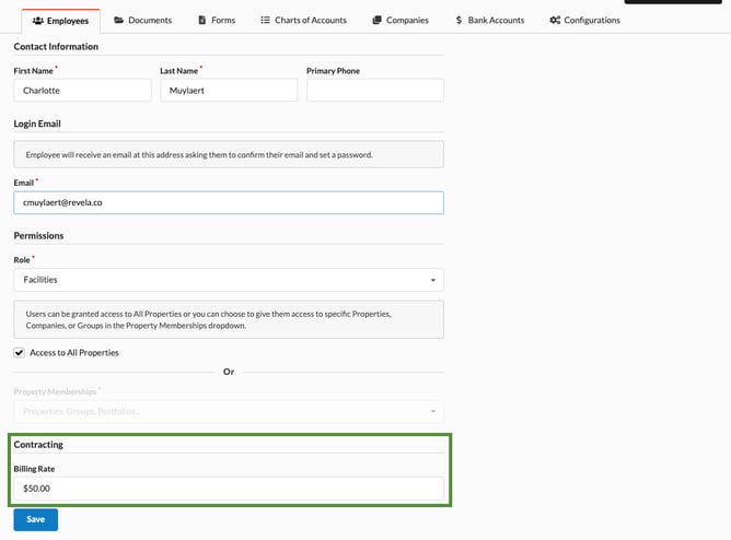 - At the bottom of the page you will see a billing rate field. Ensure that it is updated with their hourly rate.