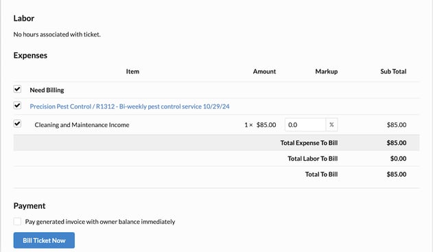 As a property manager, you may have in-house employees who are assigned to maintenance tickets. Below is the process by which they should log their hours and bill for those hours. When using Maintenance Billing, the invoice is automatically forwarded to the property owner and will appear on the owner statement.