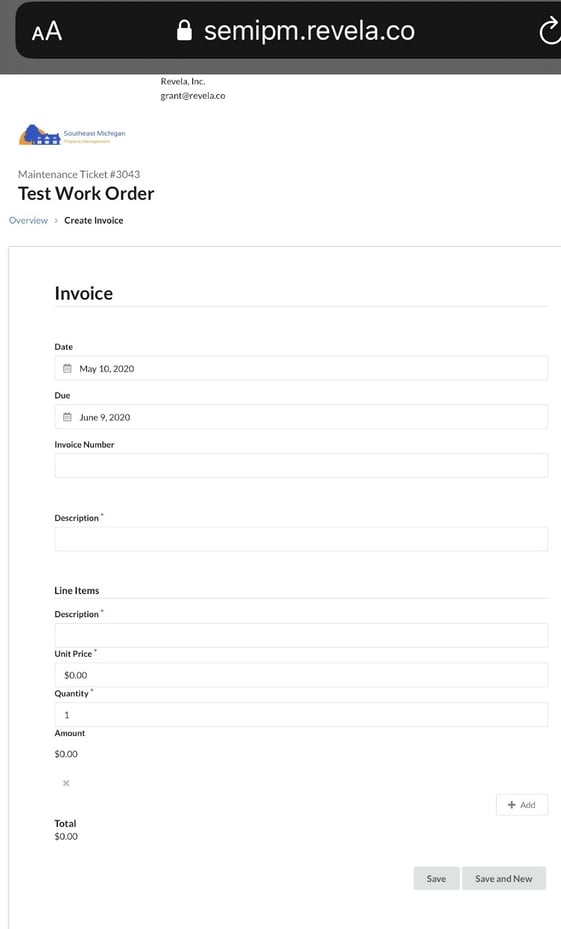Should you receive an invoice from the vendor outside of the automated system, you can quickly enter it by clicking the Invoice button in the sidebar of the maintenance ticket.