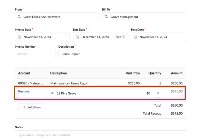 When adding a markup, the property owner will only see the markup amount and not the original amount of the invoice. The property manager will be able to see the original invoice amount along with the markup associated with each line item. The forwarded invoice will appear on the owner statement and can be paid via a Contribution or via the Owner Balance.