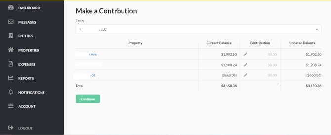 Select the appropriate entity from the dropdown menu, and determine which property to contribute to, and add the amount you wish to contribute and Continue.