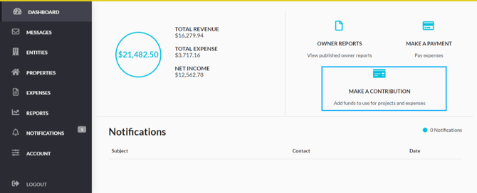 Owners can contribute and pay funds to any property that they own. This funds a property's balance. To make a contribution, log into the owner portal and the Dashboard will appear. Go to "Make a Contribution" on the right side of the screen.