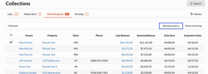 The tenant will receive a new demand letter, and their status will automatically update to Notice Sent