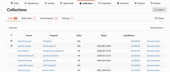 Property managers can select tenants in Notice Sent status and generate an eviction packet for legal processing