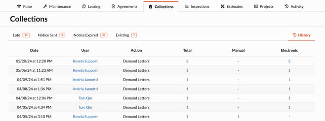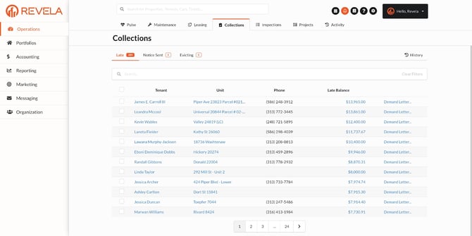 Purpose: This guide explains how to manage delinquent tenants using the Collections Dashboard in Revela, including sending demand letters, tracking notices, and handling evictions.