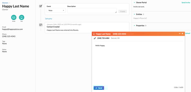 When you click on a Prospective owner contact, you'll be brought to their profile. There you can see the history of communication with that owner, schedule tasks for them, and send management agreements for signature when ready. Upon sending a management agreement to a Prospective owner, their status will change from Prospective to Active.