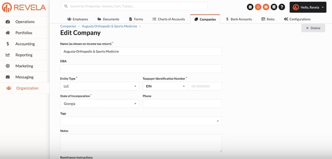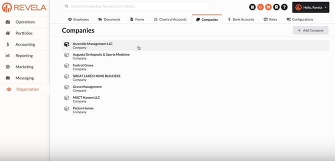 The Companies feature in Revela allows users to manage legal entities that own or manage properties.